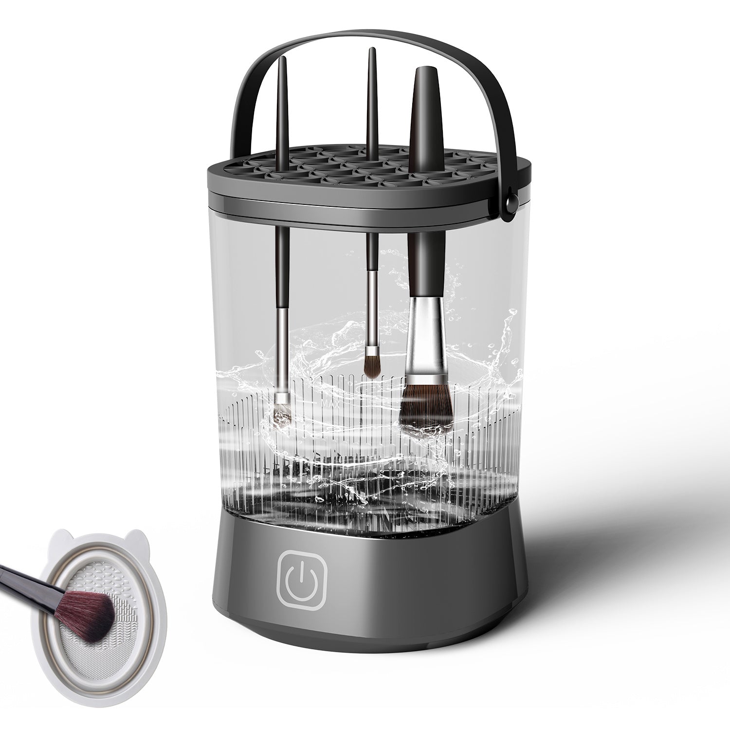 【Effortless 3 Step Operation】Simplify your cleaning routine with our makeup brush cleaner, which allows for simultaneous cleaning of multiple brushes. Simply follow these steps: 1. Pour water and cleaning solution into the cleaner. 2. Attach your brushes to the silicone holders. 3. Press and hold the switch for 3 seconds to initiate the cleaning cycle. 4. Utilize the hanging handle for natural air-drying. The included cleaning pad facilitates the removal of stubborn stains and doubles as a storage container for your brushes when used with the machine.